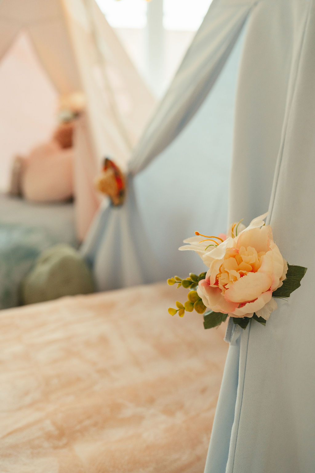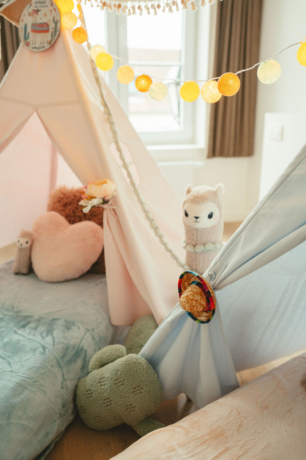 - Tipi tenten: een mix van roze, blauwe en muntkleurige tipi’s